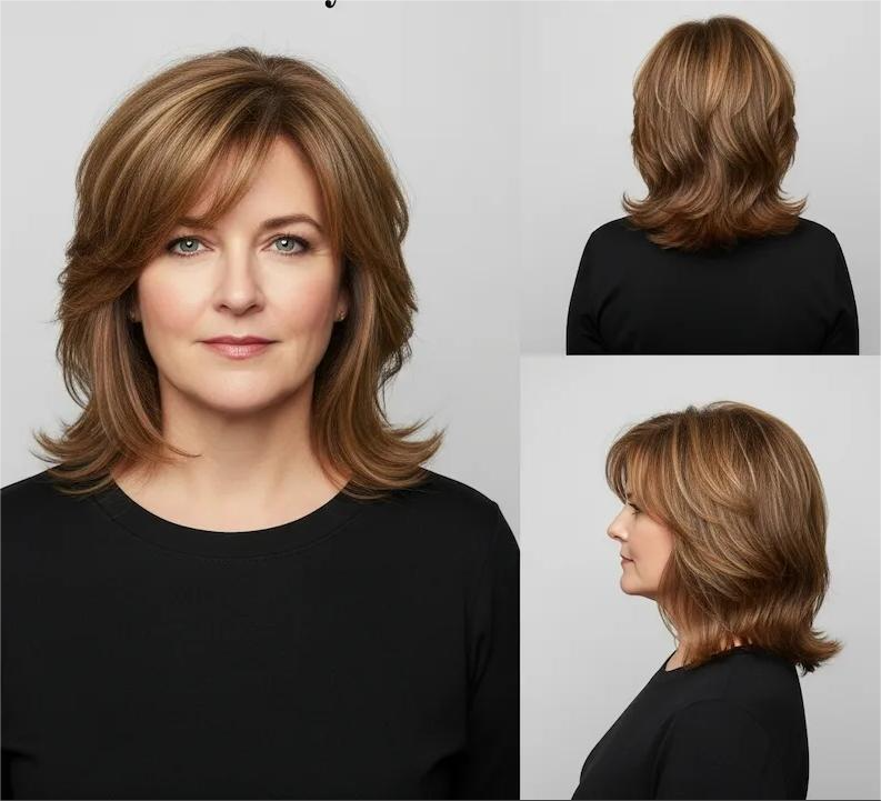 A modern hairstyle for women over 40 in 2025 shown from front, back, and side angles. This cut is stylish, elegant, and perfect for adding volume and movement.
